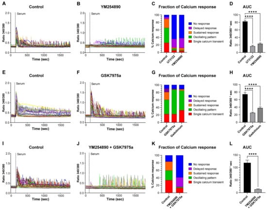 Next, we tested the effect of Ca2+ entry inhibition using GSK7975a, an inhibitor of Orai1 and -2 channels [23], and the more general Ca2+ entry blocker Gd3+ (Figure 4E,F). We evaluated their effect by measuring the AUC of Ca2+ responses corresponding to Ca2+ entry, i.e., without considering the first 3 min that represent the Ca2+ release phase (see Figure 3A). This measure showed that the AUC was decreased by 66 and 49% in the presence of GSK7975a and Gd3+, respectively (Figure 4H). In addition, both inhibitors almost fully abolished the Ca2+ responses containing a sustained phase (Figure 4G). Finally, we combined both the inhibition of Ca2+ release and Ca2+ entry (YM254890 and GSK7975a). This led to a strong, but not full, inhibition of more than 90% of the Ca2+ response (evaluated by the AUC) to serum stimulation (Figure 4I–L).