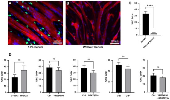 Like the in vivo MuSC, RC are quiescent cells able to be activated after adequate stimulation [11,12]. We followed their re-entry into the cell cycle as a marker of their activation. To this end, we performed EdU staining for 24 h of stimulation with serum. Our data showed that 33.9 ± 3.5% of the RC exited the quiescent state and entered the cell cycle during the first 24 h of stimulation. This effect was due to the serum as the RC maintained in a medium without serum did not activate (3.1 ± 0.8%; Figure 5A–C).