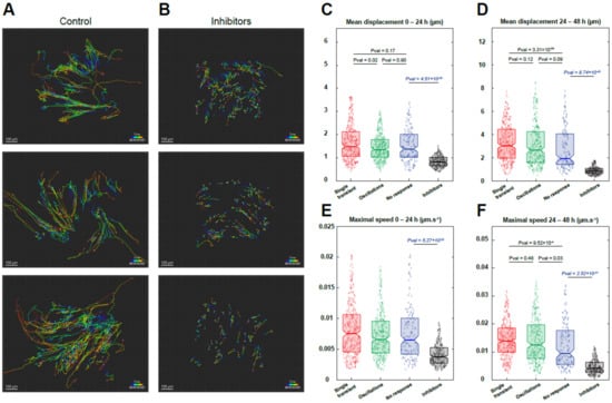 Migration of reserve cells. Myoblasts were differentiated for 48 h to obtain myotubes and RC. Cells were loaded with Cal520 to evaluate their Ca2+ response induced by serum and stained with SPY650-DNA to label the nuclei (see Materials and Methods for details). Ca2+ responses were recorded for 10 min, followed by timelapse imaging of 48 h to track the migration (A). For comparison, stimulation with YM254890 and GSK7975a (inhibitors) was performed (B). Mean displacement (distance between two time points separated by 15 min) of cells at 0–24 h (C) and 24–48 h (D), according to their Ca2+ response and compared with the condition in the presence of inhibitors. Maximum speed of cells at 0–24 h (E) and 24–48 h (F) depending on their Ca2+ response and compared with the condition in the presence of inhibitors. Statistics for “no response”, “single transient”, and “oscillations” were calculated with a Kruskal–Wallis test and multiple comparisons. Inhibitors were compared to “no response” with a Mann–Whitney test. The movement of 300–877 cells was followed from one (condition with inhibitors) to three independent experiments.