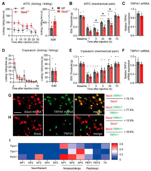 Overall, our findings suggest that Slack in sensory neurons limits the AITC-induced pain processing. These data provide further insights into the molecular mechanisms of TRPA1-mediated nociception.