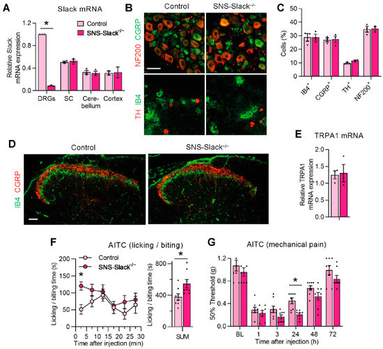 The altered AITC-induced pain behavior in global Slack knockouts, in combination with the profound co-expression of Slack and TRPA1 in sensory neurons, led us to hypothesize a specific contribution of Slack in sensory neurons to AITC-induced pain processing. To test this hypothesis, we generated SNS-Slack−/− mice that specifically lack Slack in NaV1.8+ sensory neurons [37,51]. The qRT-PCR analysis confirmed that Slack mRNA levels are massively reduced in DRGs of SNS-Slack−/− mice but not altered in the spinal cord, cerebellum, and prefrontal cortex (Figure 2A). The proportions of sensory neuron subpopulations positive for IB4 (a marker of nonpeptidergic C fiber neurons), CGRP (peptidergic C fiber neurons), TH (C fiber low-threshold mechanoreceptor neurons), or NF200 (myelinated neurons) were similar between SNS-Slack−/− and littermate control mice (Figure 2B,C). Moreover, the gross distribution of central endings of primary afferent neurons in the dorsal horn was comparable between SNS-Slack−/− and littermate control mice (Figure 2D). These histological data suggest that the lack of Slack in SNS-Slack−/− mice did not affect the morphology or general structural properties of sensory neurons. Moreover, control qRT-PCR experiments revealed that TRPA1 mRNA levels in DRGs were unaltered in SNS-Slack−/− mice (Figure 2E).