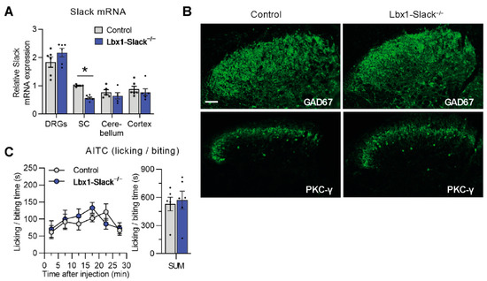 A scRNA-seq study detected Slack in neurons of the spinal dorsal horn [52], suggesting that Slack might contribute to pain processing in spinal circuits. To investigate the specific contribution of Slack in dorsal horn neurons to AITC-induced nociception, we generated Lbx1-Slack−/− mice which specifically lack Slack in spinal dorsal horn neurons. Quantitative RT-PCR analysis confirmed that Slack mRNA levels are significantly reduced in spinal cord extracts of Lbx1-Slack−/− mice but not altered in extracts of DRGs, cerebellum, and prefrontal cortex (Figure 3A). Moreover, the distribution of inhibitory interneurons that express GAD67 [53] and excitatory interneurons positive for PKCγ [54] in the superficial dorsal horn appeared normal in Lbx1-Slack−/− mice (Figure 3B), suggesting that the lack of Slack in dorsal horn neurons did not affect the morphology or general structural properties of the spinal cord. We then analyzed the behavioral responses of Lbx1-Slack−/− mice to intraplantar injection of AITC (10 mM in 20 µL saline containing 2% DMSO). In contrast to Slack−/− and SNS-Slack−/− mice, Lbx1-Slack−/− mice did not show any significant deficits in AITC-induced acute nocifensive behavior (Figure 3C), suggesting a limited contribution of Slack in dorsal horn neurons to TRPA1-mediated nociception.