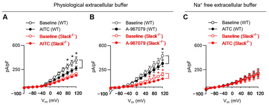 TRPA1 can also be activated by highly depolarizing voltages [15,55,56]. To discern the proportion of TRPA1-mediated IK versus Slack-mediated IK in our experimental setting, we performed additional whole-cell patch-clamp recordings in IB4+ sensory neurons in the presence of the TRPA1 antagonist A-967079 [7]. Recordings were made at baseline and 3 min after adding A-967079 (final concentration 10 µM) to the bath solution. As shown in Figure 5B, the outward current at +120 mV was significantly reduced in sensory neurons of both WT and Slack−/− mice in the presence of A-967079, suggesting that in our experimental setting, a proportion of IK is mediated via TRPA1. We then performed control experiments in a Na+ free extracellular buffer (to prevent Na+-dependent activation of Slack) and observed that AITC applied to the bath solution did not affect IK in sensory neurons from both WT and Slack−/− mice (Figure 5C).
