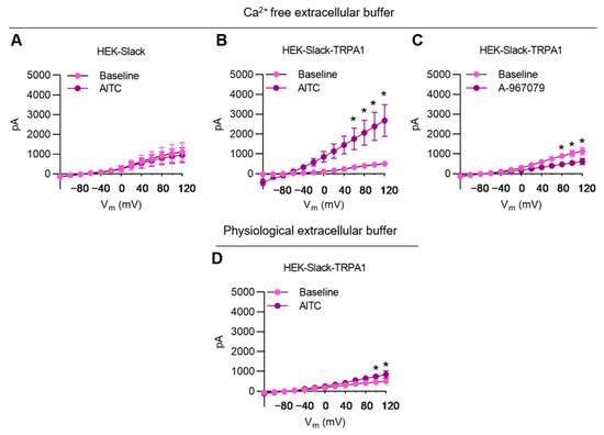 AITC-mediated modulation of potassium currents in transfected HEK293 cells. (A,B) IV relations of IK in HEK-Slack cells ((A); n = 5 cells) and HEK-Slack-TRPA1 cells ((B); n = 14 cells) obtained in whole-cell patch-clamp recordings using a Ca2+-free external solution before and after TRPA1 activation by 200 µM AITC. (C) IV relations of IK in HEK-Slack-TRPA1 cells before and after TRPA1 inhibition by 10 µM A-967079 (n = 9 cells) in whole-cell patch-clamp recordings using a Ca2+-free external solution. (D) IV relations of IK in HEK-Slack-TRPA1 cells before and after 200 µM AITC application (n = 9 cells) in whole-cell patch-clamp recordings in physiological extracellular buffer Note that in a Ca2+-free external solution, Slack-mediated IK is increased after TRPA1 activation. Data are presented as mean ± SEM. Paired t test, * p < 0.05.