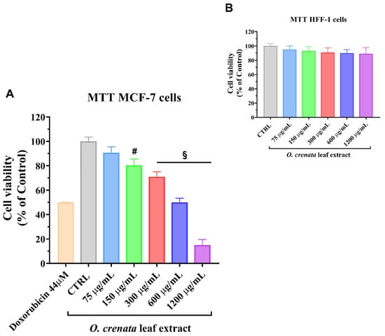 Cell viability of MCF-7 cells (A) and HFF-1 cells (B) untreated (control; CTRL) and treated for 24 h with increasing concentrations (from 75 to 1200 μg/mL) of O. crenata leaf extract. Experiments were performed using Doxorubicin as a standard cytotoxic compound. The IC50 of the standard agent was 44 ± 0.3 μM for MCF-7 cells and >100 μM for HFF-1 cells (not shown). Values are the mean ± SD of four experiments in triplicate. § p < 0.0001, # p < 0.001 vs. untreated control.