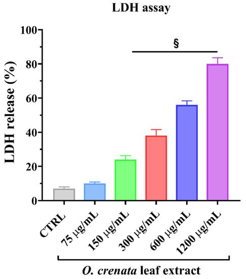 Lactic dehydrogenase (LDH) is released from MCF-7 cells at the steady state (control, CTRL) and after 24 h of treatment with increasing concentrations (from 75 to 1200 μg/mL) of OCLE. Values are the mean ± SD of four experiments in triplicate. § p < 0.0001 vs. untreated control.