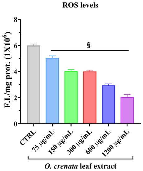 Intracellular oxidants in MCF-7 cells untreated and treated for 24 h with different concentrations (75–1200 μg/mL) of O. crenata leaf extract. Values are the mean ± SD of four experiments in triplicate. § p < 0.0001 vs. untreated control (CTRL).