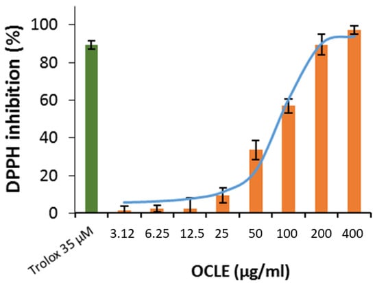 Scavenger activity against DPPH of O. crenata leaf extract (OCLE). The results are expressed as a percentage of the decrease in absorbance at λ = 517 nm compared to the standard Trolox. Each value represents the mean ± SD of three experimental measurements.