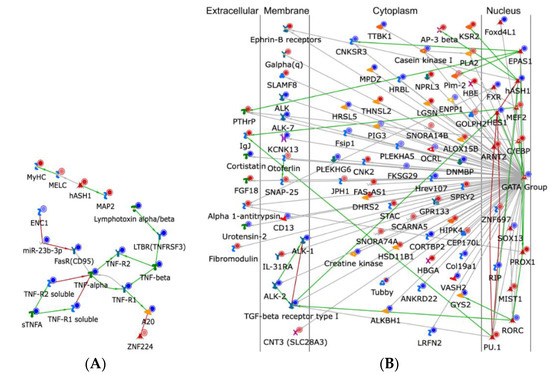 - Warde-Farley, D.; Donaldson, S.L.; Comes, O.; Zuberi, K.; Badrawi, R.; Chao, P.; Franz, M.; Grouios, C.; Kazi, F.; Lopes, C.T.; et al. The GeneMANIA Prediction server: Biological network integration for gene prioritization and predicting gene function. Nucleic Acids Res. 2010, 38, W214–W220. [Google Scholar] [CrossRef] [PubMed]