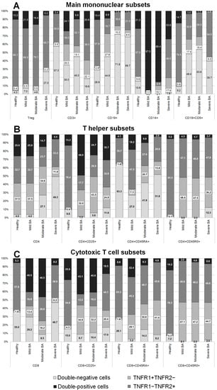 Distribution of TNFR1 and TNFR2 co-expression among main mononuclear subsets (A), among T helper subsets (B), and among cytotoxic T cell subsets (C).