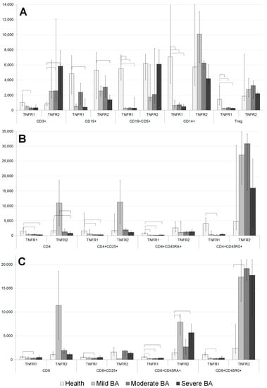 The total population of CD8+ cells was characterized by high TNFR1 expression in the patients with mild BA compared with healthy volunteers (Figure 2C). High expression levels of TNFR1 on naïve cytotoxic cells were observed in the patients with moderate and mild BA. In the patients with moderate BA, lower TNFR1 expression on the activated cytotoxic T cell subset and larger numbers of TNFR1 molecules on cytotoxic memory T cells were observed.