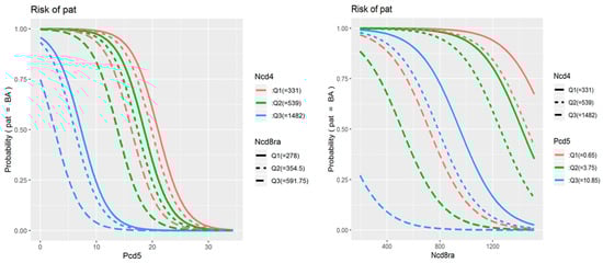 Probability of BA accessed in multivariate logistic regression analysis depending on achieved threshold levels on each of 3 parameters. Ncd4 indicates average number of TNFR1 molecules on TNFR1-positive CD4+ T helper cells; Ncd8ra indicates average number of TNFR1 molecules on TNFR1-positive CD8+CD45RA+ naïve cytotoxic T cells; Pcd5 indicates percentage of double-positive cells among CD19+CD5+ B cells. Q1, Q2, Q3 indicate three threshold levels on each of the parameters.