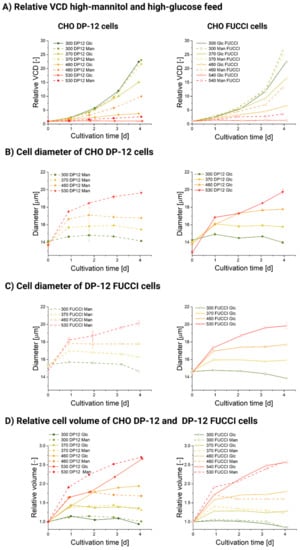The osmotic stages (shown in Appendix A, Figure A3A) exhibited highly comparable profiles between both the high-mannitol and high-glucose feed cultivations. The only exception was a slight discrepancy of 30 mOsm/kg (average for days 0–4: 435 mOsm/kg for glucose-supplemented feed and 465 mOsm/kg for mannitol-supplemented feed) in DP-12 FUCCI cells stage cultivations. Otherwise, the stages were achieved with a high accuracy for each cell line. Therefore, we conclude that the differences we observed in growth, viability, and diameter between the mannitol- and glucose-exposed cells were not caused by differences in the ambient osmolality.