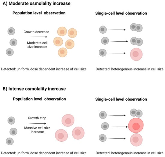 As it has been shown in previous studies and it was described above, the mean diameter of the cell population positively correlates with the ambient osmolality increase. This has previously led researchers to conclude that there is a direct dose-dependent effect between the two factors, i.e., that higher osmotic pressure leads to a faster and more pronounced increase in cellular diameter (shown in Figure 2, left). However, population-wide observations can mask the behavior of single cells. In other words, during heterogeneous cellular stress response, some cells manage to retain their normal size and continue to proliferate, but other cells get engaged in mass gain without proliferation (shown in Figure 2, right). This could lead to the same observed mean population-level outcomes. In that case, a stepwise increase in osmolality would shift the fraction of the cells that are still able to proliferate and those that cannot (moderate and intense osmolality increase, shown in Figure 2).