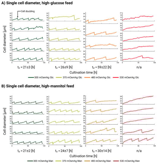 The results of the cellular diameter measurements are shown in Figure 3. Cellular division is seen as a vertical drop in the diameter curve. The calculated td for each condition is listed below the graphs in Figure 3A,B. Although the doubling time estimation was performed only on five cells, the results still correlate well with the population data, which are presented in Table 3. The cells under the normal cultivation conditions (300 mOsm/kg) divide four to five times within the observation period (96 h). The cells in the 370 Glc and the 460 mOsm/kg Glc and Man conditions show mixed population behavior which strongly supports the suggestion of the mechanism shown in Figure 2, right, i.e., that cells either divide (although at a slower rate) and retain their normal diameter range or accumulate mass leading to an overall observable diameter increase.