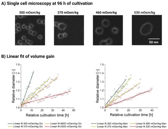 Data on single-cell cultivation of CHO DP-12 cells exposed to high-glucose and high-mannitol feed over the cultivation duration [h]. (A) Representative microscopic photographs of the CHO-DP-12 cells exposed for 96 h to different osmotic treatments (high-mannitol feed). (B) Relative diameter gain based on one randomly picked cell taken for one division period after at least 24 h of hyperosmolality exposure. Relative diameter [–], without dimension.