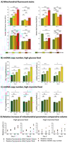 Mitochondrial parameters measured on day 2 and day 4 of the stage cultivations. Here, 300, 370, 460, and 530 stand for 300, 370, 460 and 530 mOsm/kg ambient osmolalities. (A) Median fluorescence intensities of the cell population previously gated for live and single cells of CHO DP-12 cells stained with MitoTracker® Green FM, (ThermoFisher Scientific, Waltham, MA, USA) and MitoTracker® Red CMXRos (Cell Signalling Technology Inc., Danvers, MA, USA) exposed to high-mannitol and high-glucose feeds determined by the flow cytometry analysis. Relative mtDNA copy numbers (RQ Target/Reference) and calibrated normalized relative quantities (CNRQ normTar/Ref) of the CHO DP-12 cells exposed to (B) high-glucose feed and to (C) high-mannitol feed. (D) Volume, mtDNA copy number, and median fluorescence intensities of MitoTracker® Green FM, (ThermoFisher Scientific, Waltham, MA, USA) and MitoTracker® Red FM-stained (Cell Signalling Technology Inc., Danvers, MA, USA) populations relative to the parameters measured in the untreated populations (300 mOsm/kg condition). Statistical significance by a two-tailed Student’s t-test with the statistically significant threshold of p < 0.05; the notations of * (p < 0.05), ** (p ≤ 0.01), and *** (p ≤ 0.001) were used.