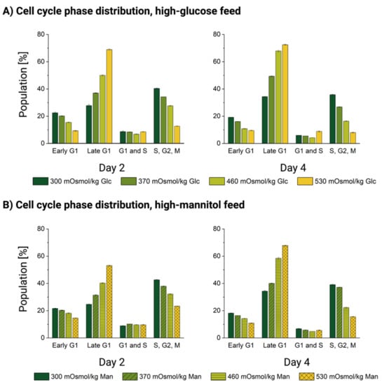 Glucose concentration profiles are shown in Appendix A, Figure A3B. In mannitol-supplemented cultures, glucose concentration remained rather stable and did not exceed 55 mMol (day 2, 530 Man CHO DP-12 FUCCI). For glucose-supplemented stages, glucose concentration was much more stratified and reached 176.05 mMol on day 3 in the 530 mOsm/kg Glc DP-12 FUCCI and 215.3 mMol on day 1 for the CHO DP-12 530 mOsm/kg Glc. Glucose oversupplementation in concentrations above 100 mMol seems to have specific detrimental effects on the cells exceeding those caused by mannitol-induced osmotic effects, as it can be seen from the VCD plot in Figure 1. The measured lactate concentrations, shown in Appendix A, Figure A3, did not exceed 20 mMol and are known to be well tolerated by the cells [45].