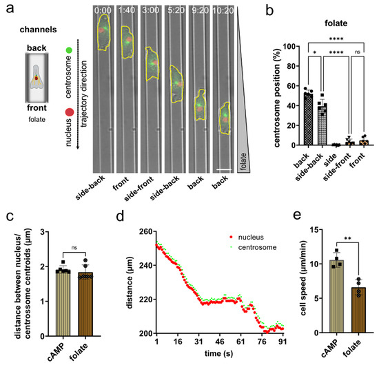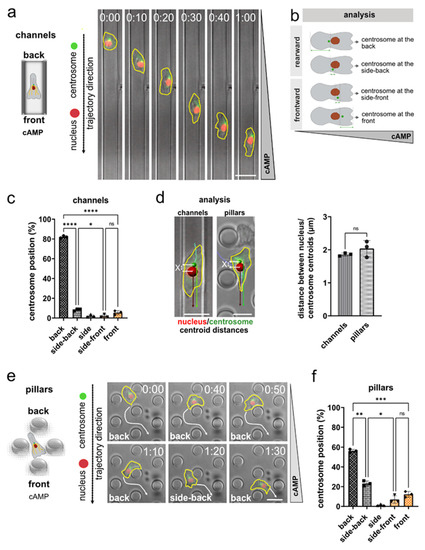 For cAMP or folate chemotaxis experiments in linear microchannels (Figures S1a,b and S2b,c), the positions of the nucleus and centrosome along the cell axis were manually determined by measuring their distance from the cell rear in relation to the cell length, to calculate their relative intracellular position along the cell axis (Figure S1d). From this dataset, we further calculated the centrosome-to-nucleus distance (Figure S1e) and the nucleus/centrosome centroid relative distance to the cell center (Figure S2).