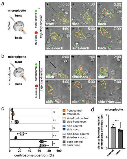 To corroborate these results, we investigated the orientation of the centrosome–nucleus axis while Dictyostelium migrates within a gradient of cAMP released from a micropipette (Figure 2a,b). The repositioning of the micropipette filled with cAMP, causes a local change within the gradient, which is sensed by the cells and causes reorientation towards the pipette tip within seconds [60]. While Dictyostelium cells migrated in this experiment on a two-dimensional surface, their path was not dictated by the microenvironment and, thus, allowed non-straight migration, such as between micropillars (Video S3). Moreover, in this experimental setting, we observed a non-random orientation of the centrosome–nucleus axis, with the centrosome located behind the nucleus (Figure 2c).