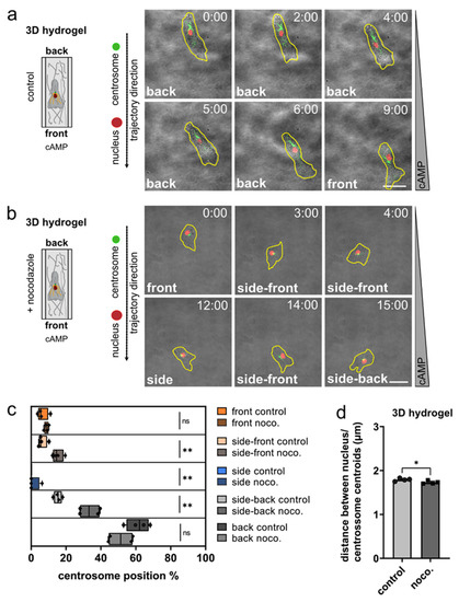 We then tested whether the observed configuration of the centrosome-to-nucleus axis can be characterized as well in three-dimensional matrices, which represent a close proxy of natural environments. To this end, we imaged chemotactic migration of Dictyostelium in hydrogel, as well as collagen matrices (Figure 3; Figure S4). As in 2D migration, Dictyostelium cells moving in 3D showed a strong preference to position the centrosome behind the nucleus (Figure 3a; Video S5). This location was altered upon depolymerization of microtubules (Figure 3b; Video S6), which resulted in the centrosome being found much more frequently on the side or front-ward of the nucleus (Figure 3c). It should also be noted that, in nocodazole-treated cells, the distance between the centrosome and the nucleus was slightly reduced (Figure 3d).