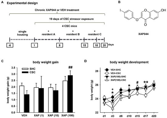 Interestingly, most of these CSC-induced physiological and lymphatic organs changes found in VEH-treated mice were attenuated or even abolished in mice chronically treated with XAP044 i.c.v., with the effects being strongly dose-dependent. For example, although the body weight gain of SHC and CSC mice treated with 1 µM and 10 µM of XAP044 was comparable to the weight gain of the respective VEH group, the highest level of body weight gain was found in CSC mice treated with 100 µM of XAP044. Moreover, in mice treated with 100 µM of XAP044, a CSC-induced decrease in body weight was only detectable on day 3 of CSC. Treatment with 100 µM of XAP044 was able to block the CSC-induced decrease in body weight found in VEH-treated mice on day 10 and 17. Furthermore, the body weight of CSC mice treated with 100 µM of XAP044 was even significantly higher compared to CSC mice of the VEH group on day 15 of CSC, supporting a stress-protective effect of XAP044 treatment with respect to body weight development.