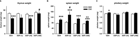CSC housing has also been shown to induce changes in the weight of lymphatic organs. For example, 19 days of CSC exposure typically induce thymus atrophy and splenomegaly [23,29]. Those CSC effects were also present in the VEH group of the present study. In detail, absolute thymus weight was decreased in CSC compared to SHC mice treated with VEH (p ≤ 0.001). This CSC-induced thymus atrophy was also present in mice treated with 10 µM (p = 0.001), but absent in mice treated with 1 µM and 100 µM of XAP044 (Figure 2A). Moreover, the thymus weight of CSC mice treated with 100 µM was also higher compared to CSC mice treated with VEH (p = 0.018), as well as with 10 µM of XAP044 (p = 0.016). It should be noted that the absence of an CSC effect in mice treated with 1 µM of XAP044 might be due to the high standard error resulting from the lower number of animals used for the 1 µM-experiments. Together, it seems that at least 100 µM of XAP044 has a stress-protective effect with respect to the typical CSC-induced thymus atrophy.