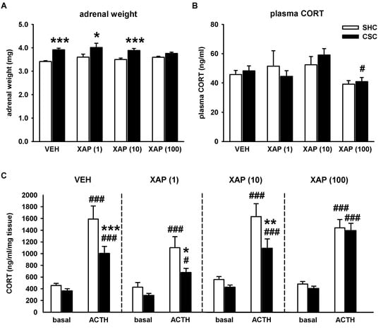 We further analyzed the potential treatment-dependent effects of CSC exposure on adrenal ACTH responsiveness in vitro. In all groups, adrenal explants from both SHC (p ≤ 0.001 for each) and CSC (VEH: p ≤ 0.001; 1 µM XAP044: p = 0.029; 10 µM XAP044: p = 0.001; 100 µM XAP044: p ≤ 0.001) mice showed an increased CORT secretion in response to ACTH compared to basal (saline) stimulation. However, in mice treated with VEH, 1 µM or 10 µM of XAP044, ACTH-induced adrenal CORT secretion was lower in CSC compared to SHC mice (VEH: p ≤ 0.001; 1 µM XAP044: p = 0.016; 10 µM XAP044: p = 0.006). This CSC-induced attenuation of adrenal in vitro ACTH responsiveness was abolished in mice treated with 100 µM of XAP044 (Figure 3C). Together, the results indicate a chronic stress-protective effect of XAP044, at least at the dose of 100 µM, with respect to CSC-induced HPA axis-related dysfunctions.