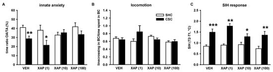 With respect to the SIH test, ANOVA revealed a CSC-induced increase in the hyperthermic response in mice irrespective of treatment (VEH: p ≤ 0.001; 1 µM XAP044: p = 0.002; 10 µM XAP044: p = 0.027; 100 µM XAP044: p = 0.005; Figure 4C), which indicates an increase in physiological anxiety. Together, these results suggest a dose-dependent beneficial effect of XAP044 treatment on innate but not physiological anxiety in mice.