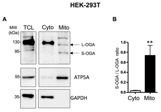 To further establish the cellular localization of S-OGA and L-OGA, we transfected GFP-tagged versions of these proteins in HEK-293T cells (Supplementary Figure S2B). In agreement with Keembiyehetty et al. [28], transfected GFP-tagged S-OGA and L-OGA were detected with an anti-GFP antibody as bands of about 130 kDa and 160 kDa, respectively, as expected for proteins of about 95 and 130 kDa fused with the 28 kDa GFP protein. As shown in Supplementary Figure S2B, GFP-tagged L-OGA was more abundant than S-OGA-GFP in the cytosolic-enriched fraction. In contrast, GFP-tagged S-OGA was more abundant than GFP-tagged L-OGA in the mitochondria-enriched fraction, despite higher expression of GFP-tagged L-OGA in total cell lysates, confirming the preferential addressing of S-OGA in the mitochondria (Supplementary Figure S2B,C). Preferential localization of S-OGA in the mitochondria-enriched fraction was even more obvious when HEK-293T cells were co-transfected with cDNA coding for GFP-tagged S-OGA and L-OGA. In these cells where both S- and L-OGA were overexpressed, the mitochondria-enriched fraction contains mainly GFP-tagged S-OGA, whereas GFP-tagged L-OGA was much more abundant in the cytosolic fraction (Supplementary Figure S2D,E). Preferential recovery of GFP-tagged S-OGA in mitochondrial fraction was also observed in MEF transfected with these constructs (Supplementary Figure S2F,G).
