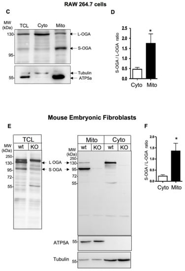 Detection of long and short OGA isoforms in HEK-293T cells and mouse embryonic fibroblasts (MEF). (A) Detection of endogenous S-OGA (~95 kDa) and L-OGA (~130 kDa) bands in total cell lysates (TCL), mitochondrial-enriched (Mito), and cytosolic-enriched (Cyto) fractions from HEK-293T cells by Western blotting with anti-OGA Novus antibody. Mitochondrial and cytosol fractions were controlled using anti-ATP5A and anti-GAPDH antibodies. The 95 kDa band was essentially recovered in the mitochondria-enriched fraction, whereas the 130 kDa band was mostly recovered in the cytosol-enriched fraction. (B) Densitometric analysis of the 95 kDa and 130 kDa OGA bands in HEK-293T cells. The results are the mean ± SEM of the ratio of the 95 kDa to the 130 kDa OGA bands detected in cytosol- and mitochondria-enriched fractions (n = 9; **: p < 0.01). (C) Detection of endogenous S-OGA (~95 kDa) and L-OGA (~130 kDa) bands in total cell lysates (TCL), mitochondria-enriched (Mito), and cytosol-enriched (Cyto) fractions from RAW 264.7 cells by Western blotting with anti-OGA Novus antibody. Mitochondrial and cytosol fractions were controlled using anti-ATP5A and anti-tubulin antibodies. The 95 kDa band was predominant in the mitochondria-enriched fraction, whereas the 130 kDa band was predominant in the cytosol-enriched fraction. (D) Densitometric analysis of the 95 kDa and 130 kDa OGA bands in RAW 264.7 cells. The results are the mean ± SEM of the ratio of the 95 kDa to the 130 kDa OGA bands detected in cytosol- and mitochondria-enriched fractions (n = 8; *: p < 0.05). (E) Detection of endogenous S-OGA (~95 kDa) and L-OGA (~130 kDa) bands in total cell lysates (TCL), mitochondria-enriched (Mito), and cytosol-enriched (Cyto) fractions from wild-type (wt) and OGA-KO mouse embryonic fibroblasts (MEF) by Western blotting with anti-OGA Novus antibody. Mitochondrial and cytosol fractions were controlled using anti-ATP5A and anti-tubulin antibodies. The 95 kDa band was predominant in the mitochondria-enriched fraction of wt-MEF, whereas the 130 kDa band was predominant in the cytosol-enriched fraction of wt-MEF. Both bands were absent in the corresponding fractions in OGA-KO MEF. An additional band (about 180 kDa) was also detected in total cell lysates, but this band was present in both wt and OGA-KO MEF, indicating that it corresponded to an unrelated protein. (F) Densitometric analysis of the 95 kDa and 130 kDa OGA bands in wt-MEF. The results are the mean ± SEM of the ratio of the 95 kDa to 130 kDa OGA signals detected in cytosol- and mitochondria-enriched fractions (n = 6; *: p < 0.05).
