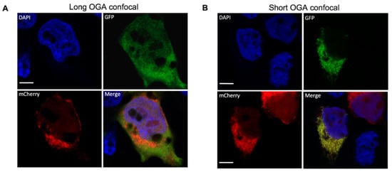In agreement with Keembiyehetty et al. [28], our confocal experiments indicated that L-OGA located diffusely in the cytosol and the nucleus, whereas S-OGA seems to be excluded from the nucleus. Our Western blotting and confocal microscopy experiments indicated that S-OGA is essentially addressed to the mitochondria, although other cellular localization cannot be excluded. Interestingly, Keembiyehetty et al. [28] found that S-OGA was localized associated with nascent lipid droplets in HeLa cells incubated with oleate. These authors proposed that the short OGA isoform participates in the regulation of lipid droplet assembly and mobilization. Numerous studies indicate physical as well as functional interactions between mitochondria and lipid droplets, facilitating lipid droplet mobilization and fatty acid oxidation [51,52,53,54]. Our observation that S-OGA is found associated with mitochondria suggests that this isoform may participate in the regulation of mitochondria–lipid droplet dialogue. This point certainly deserves further investigations.