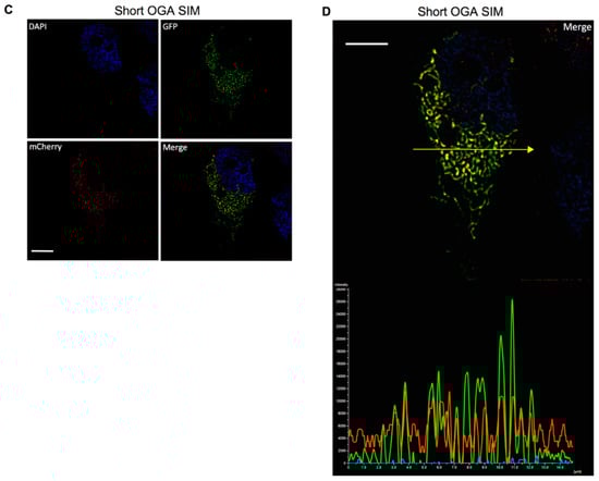 Although S-OGA is clearly preferentially recovered in the mitochondrial-enriched fractions, both S-OGA and L-OGA isoforms were detected in cytosolic and mitochondrial fractions. Nonetheless, mitochondrial- and cytosol-enriched fractions may have cross-contaminated each other during the centrifugation procedure, resulting in the recovery of S-OGA in the cytosolic fraction and L-OGA in the mitochondrial fraction. To confirm specific localization of S-OGA in the mitochondria, we used confocal microscopy. Since no antibodies are available to specifically detect the short OGA isoform by cell imaging, we co-transfected HEK-293T cells with cDNAs coding for either GFP-tagged short or long OGA isoforms and a mitochondrial-targeted mCherry protein. Confocal microscopy imaging (Figure 2) revealed that L-OGA isoform was diffusively found in the cytosol and the nucleus (Figure 2A), whereas S-OGA was not detected in the nucleus (Figure 2B), in agreement with Keembiyehetty et al.’s observation [28]. In contrast, S-OGA isoform co-localized with mitochondrial mCherry protein (Figure 2B), indicating specific mitochondrial addressing of this isoform. Mitochondrial localization of the short OGA isoform was confirmed using structured illumination microscopy [45] (Figure 2C,D).