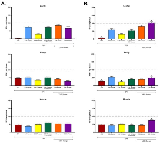 Ice-free vitrification of pulmonary heart valves comparing impact of loading with DP6 on viability after vitrification in DP6 + disaccharides or VS55 + disaccharides. (A) No Fe, with boundary warming. (B) Nanowarmed with Fe. The top graph in each case is leaflets, center is pulmonary artery, and the bottom is fibrous muscle band at the base of the heart valve. Viability was assessed using alamarBlue. The best outcomes were observed with VS55 + 0.6 M trehalose and nanowarming for each tissue type. The results are shown as the mean ± 1 standard error, p < 0.05. * comparison of ±Fe.
