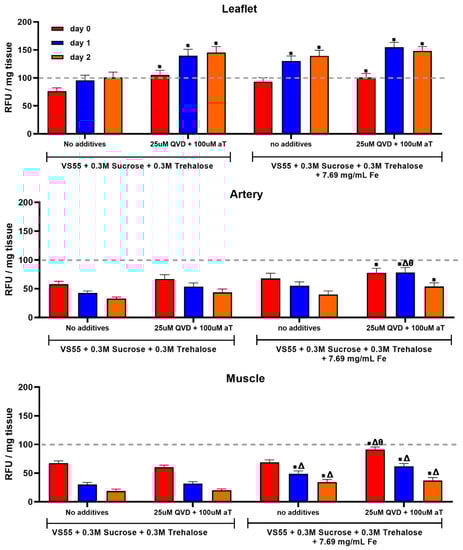 In select experiments, the heart valve tissue components were placed in culture medium with a combination of supplements, 25 µM Q-VD-OPH (QVD, MP Biomedical, Irvine, CA, USA) and 100 µM α-tocopherol group (vitamin E, Sigma Aldrich, St. Louis, MO, USA), during physiological tissue culture for 4 h before testing with alamarBlue.