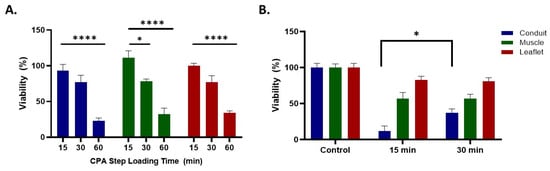 Aortic valve viability after loading, CPA exposure, and rewarming. (A) CPA exposure toxicity on heart valve tissues. Heart valve was exposed to CPA in stepwise manner for various time intervals. Longer exposure reduced the viability of the samples due to CPA toxicity. N = 5–11 (B) Heart valve nanowarming recovery viability using different CPA loading durations. N = 6–15. Viability was assessed using alamarBlue. Statistical significance is indicated with asterisks: * p < 0.05; p < 0.001; **** p < 0.0001. The one-way and two-way analysis of variance (ANOVA) with Tukey’s multiple comparison tests (GraphPad Prism, GraphPad® Software, Inc., San Diego, CA, USA) were performed on data presented as the mean ± 1 standard error.