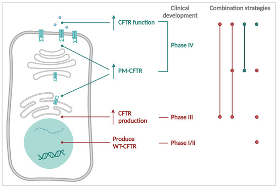 Global overview of therapeutic strategies for causal treatment of CF and their current progress in clinical development. On the right, strategies are represented by dots, and lines connecting them indicate combination therapies, either market-approved (green), or in clinical development (red). WT: wild-type. PM: plasma membrane.
