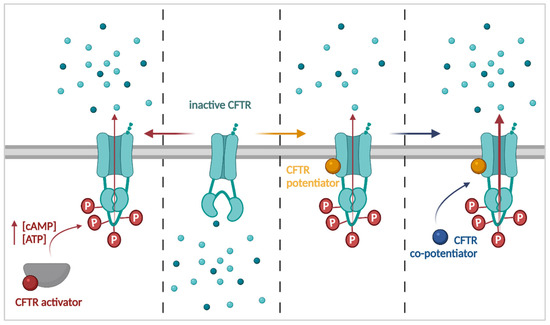 Strategies to improve CFTR function. Left: Activators (red) improve CFTR function by altering its normal regulation, for example by promoting phosphorylation of CFTR or via ATP analogues which lock CFTR in an open state. Right: CFTR potentiators (orange) interact directly with CFTR to promote function, in a phosphorylation-dependent, but ATP-independent manner. Co-potentiators (blue) also interact with CFTR, to further stimulate function but only in the presence of CFTR potentiators.