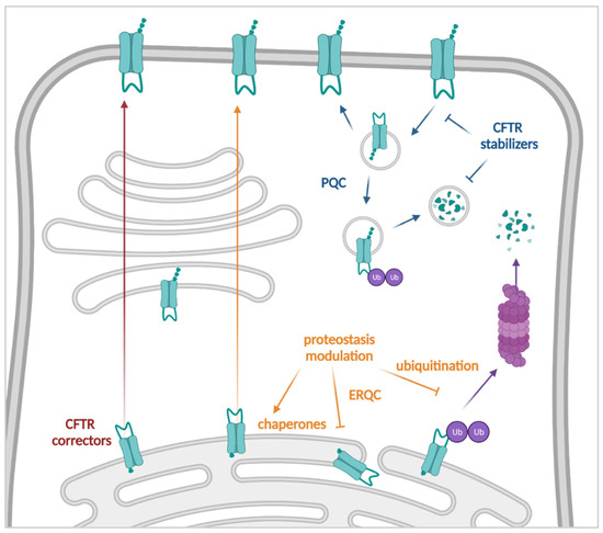 Strategies to improve the amount of CFTR channels at the plasma membrane (PM). CFTR correctors (red) interact directly with CFTR to improve its folding and subsequent trafficking. Targeting CFTR interactors through proteostasis modulation (orange) allows mutant CFTR to escape early degradation and traffic to the PM. Stabilizers (blue) prolong the duration of CFTR’s residence at the PM by slowing down its turn-over and peripheral degradation. ERQC: Endoplasmic Reticulum Quality Control; PQC: Peripheral Quality Control.
