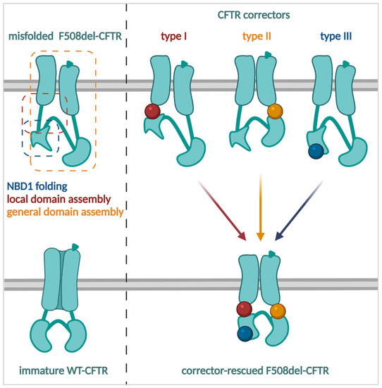 Different types of CFTR correctors. Left: The F508del-CFTR protein is misfolded and does not achieve the native conformation of wild-type (WT)-CFTR. Schematic overview of folding defects associated with the F508del mutation. Right: Type I, II, and III correctors tackle different folding defects, which alone or in combination (partially) rescue F508del to a more WT-like state.