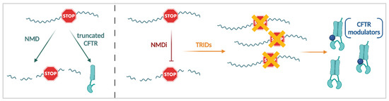 The majority of PwCF who are currently not eligible for causal CF therapies have one or two nonsense CFTR mutations. Approximately 5% of all CF alleles in the CFTR2 database are nonsense mutations, which create PTCs, giving rise to truncated proteins but also, in many cases, which prime the CFTR mRNA for NMD (Figure 7; left panel). For a review on NMD in health and disease, we refer to [261]. A PTC can trigger NMD when it generates long 3′UTRs or when exon junction complexes (EJC) are formed downstream of the PTC. NMD reduces the amount of mutant CFTR mRNA and hampers subsequent rescue of the CFTR protein by other means, such as by TRIDs (discussed next) and by CFTR modulators [262,263]. The level of NMD differs not only between cell-types, but also depends on the specific PTC mutation. In addition to this, individual variation is at play, as seen between PwCF with the same genotype [46,262,264,265]. Clarke and colleagues reported that in primary nasal epithelial cells from 10 PwCF carrying the G542X/F508del genotype, mRNA expression of the G542X alleles was reduced by ~60% [264]. Differences in the abundance of the 3′ and 5′ of the CFTR mRNA suggest that some of the mRNA is partially degraded and not a suitable substrate for full-length protein translation [46]. Making sure that a sufficient amount of suitable CFTR mRNA is available is therefore the first important step towards effective treatments for PTC-induced CF (Figure 7; right panel). Several strategies have been proposed in pre-clinical models to prevent NMD and enhance mRNA expression of PTC CFTR (reviewed in [266,267]). Inhibition of the NMD activator serine/threonine-protein kinase SMG1, via the small molecule inhibitor SMG1i, resulted in increased levels of G542X, W1282X and other PTC containing mRNAs in various models, including airway epithelial cells, primary rectal organoids and several CF animal models [58,268,269,270,271,272,273,274]. As SMG1 is active in other cellular processes besides NMD, its inhibition causes considerable toxicity, which likely precludes it from translation into a therapy [272,275]. Similarly, siRNA mediated knockdown of the regulator of nonsense transcripts, UPF1—which gets phosphorylated by SMG1 [276]—increased mRNA levels of exon 22 PTC mutations, increasing their overall response to other therapies [277]. In addition, inhibition of the interaction between UPF1 and SMG7 by small molecule NMDI-14, suppressed NMD and stabilized W1282X mRNA [263]. Some compounds, like the clinically approved drugs amlexanox and escin were suggested to provide dual NMD and PTC suppression [272,278,279]. All of these treatments, however, inhibit the NMD machinery in a non-CFTR specific manner, thereby posing potential unwanted side-effects related to unspecific NMD suppression.