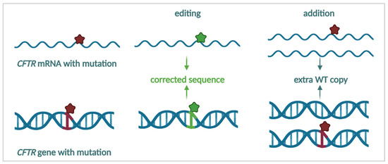 The previously discussed strategies have focused on enhancing CFTR production, trafficking, function and stabilization. Alternatively, rather than repairing an “impaired” CFTR protein, one might circumvent this by providing either a new “blueprint” to generate WT-CFTR or by repairing the mutation on the mRNA or DNA level (Figure 8). The final strategies we will discuss in this review will focus on restoring the production of WT-CFTR as a causal treatment for CF.