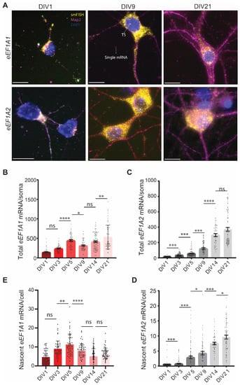 Wefers, Z.; Alecki, C.; Huang, R.; Jacob-Tomas, S.; Vera, M. Analysis of the Expression and Subcellular Distribution of eEF1A1 and eEF1A2 mRNAs during Neurodevelopment. Cells 2022, 11, 1877. https://doi.org/10.3390/cells11121877