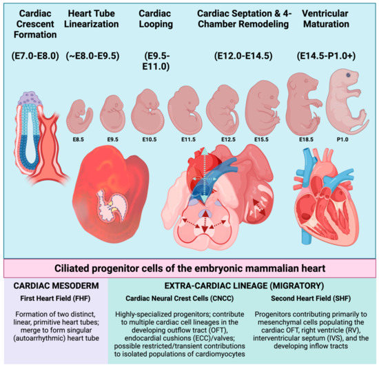 Schematic overview of embryonic heart development in the mouse. Embryonic days of gestation (“E”) are indicated beneath each stage and indicate the number of days post-coitus. Mammalian cardiogenesis involves an intricate number of developmental stages, many of which are orchestrated by, and are dependent upon, the presence of intact primary cilia (From left to right). Broadly speaking, embryonic heart development in the mouse can be divided into stages involving the initial formation of cardiac crescent/primitive heart tube, linearization of the heart tube, cardiac looping (to orient the future chambers in space), cardiac septation, and ventricular remodeling and maturation. Each of these stages requires cellular contributions from one or more of the progenitor cell populations indicated beneath the illustration. These progenitors elaborate primary cilia and originate either intrinsically from within the cardiac mesoderm, or they must migrate to the developing heart from an extra-cardiac location. Upon arrival near or within the developing heart, CNCC and SHF progenitors will later differentiate into many of the terminally differentiated cell types. First heart field (FHF); cardiac neural crest (CNCC); outflow tract (OFT); endocardial cushions (ECC); second heart field (SHF), right ventricle (RV); and interventricular septum (IVS). Figure created with Biorender.com (accessed on 29 May 2022).