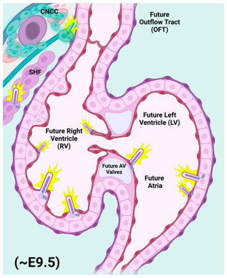 - Buckingham, M.; Meilhac, S.; Zaffran, S. Building the Mammalian Heart from Two Sources of Myocardial Cells. Nat. Rev. Genet. 2005, 6, 826–835. [Google Scholar] [CrossRef] [PubMed]
