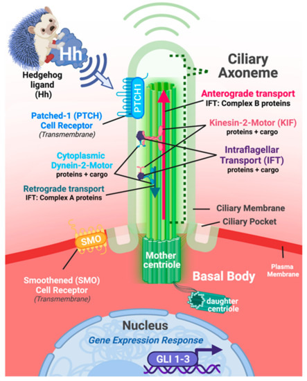 Primary cilia are dynamic, sensory organelles tasked with interpreting changes to and within the intra- and extracellular environments. Illustrative representation of the approximate composition and location of a generic eukaryotic cell and its intact primary cilium. On the apical surface of the cell, the primary cilium forms its axonemal portion as an extension of the plasma membrane protruding outward towards the extracellular environment. The ciliary axoneme is structurally supported within by the 9 + 0 microtubule scaffold that anchors the cilium to the body of the cell via the basal body complex, which is composed of both mother and daughter centrioles. Experimental modeling of cells, tissues, and diseases involving damage to or loss of primary cilia typically involve the genetic manipulation of genes and proteins critical for maintaining intraflagellar transport (IFT; protein + cargo) and/or kinesin-2-motor protein transport (protein + cargo). Elaboration of the cilium and maintenance of protein transport in the anterograde direction requires IFT Complex B proteins. Conversely, retrograde transport requires IFT Complex A proteins. In both directions, IFT proteins are acting as a scaffold to connect the respective motor complexes to the transported cargo components. Many receptors localize to the plasma membrane/ciliary membrane of the axoneme, the ciliary pockets and/or basal body region of the primary cilium complex, and can subsequently be affected, should genetic and/or environmental damage to the cilium occurs. The Hedgehog signaling pathway is closely associated with the primary cilium and serves as a critical regulator of mammalian development. Transduction of canonical Hedgehog signaling involves two co-receptors, Patched-1 (Ptch1) and Smoothed (SMO), both of which shuttle dynamically between the plasma membrane portion of ciliary axoneme itself and just outside of the base of the cilium. Hedgehog signal transduction leads to modification in the expression and protein activity of GLI gene family members encoding DNA-binding transcription factors (GLI 1-3). Size, length, and general structure of the cell/primary cilium illustrated above reflect a generalized example for illustrative purposes; Figure created with Biorender.com (accessed on 29 May 2022).
