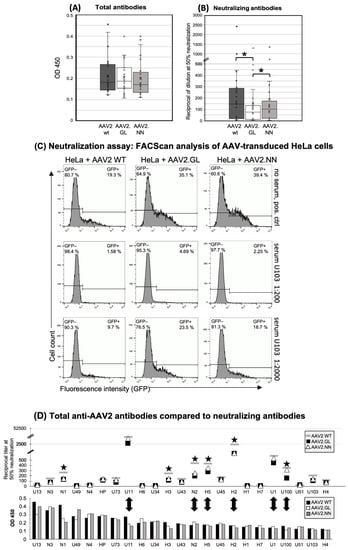 Figure 1. Human antibody responses to AAV2 WT, AAV2.GL, and AAV2.NN capsids. (A) Total Ig antibody responses (IgM, IgG, IgA) to the AAV capsids calculated from the ODs of all samples at a serum dilution of 1:400. n = 23. (B) Neutralizing antibodies shown as the reciprocal of the serum/plasma dilution at 50% inhibition of HeLa cell transduction (* p < 0.01). The small circles show the individual data points, the central line shows the median, the x represents the mean, and the whiskers above and below display the minimum and maximum within 1.5 interquartile range (IQR) of the lower and upper quartile. n = 23. (C) Representative histograms of the FACS analysis of AAV-transduced HeLa cells without serum (negative control, no neutralization, upper panel) and with serum U103 diluted 1:200 (strong neutralization, middle panel) and 1:2000 (reduced neutralization, lower panel). The left lines in each histogram show the gate of the non-transduced, eGFP-negative cells (percentage of cells in the upper left corner), and the right lines show the gate of the GFP-positive, vector-transduced cells (percentage of eGFP+ cells shown in the upper right). (D) Comparison of total and neutralizing antibodies for each donor. Upper panel: neutralizing antibodies, lower panel: total antibodies, shown as mean OD 450 of triplicates at sample dilutions of 1:200. Black stars mark samples with decreased neutralization of engineered capsids; double arrows high neutralizers and the respective total anti-capsid antibodies. n = 23 samples. The data shown are representative of repeated experiments. Statistics were performed using the Friedman test and Dunn´s Multiple Comparison test, and significance was defined as a p value of <0.05 (* p < 0.01).