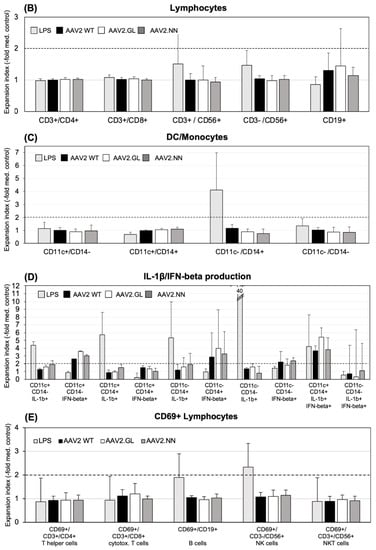 Figure 3. Expansion of cell populations after in vitro stimulation with AAV vectors. (A) Cells were gated for FACScan analysis according to FSC (forward scatter) and SSC (side scatter) in the “innate cells” population including monocytes/macrophages, DCs and granulocytes, and “lymphocytes”, including B, T, and NK/NKT cells (see the Materials and Methods section for more details). (B) CD3+ T cells (CD4+ Th, CD8+ cytotoxic T and CD56+ NK-T cells, CD3-CD56+ NK cells, and CD19+ T cells were analyzed from the lymphocyte gate. (C) CD11c+/CD14- DCs, CD11c+/CD14+ monocyte-derived DCs, and CD11c-/CD14+ monocytes were analyzed from the “innate cells” gate. (D) Surface staining for DCs and monocytes was combined with cytoplasmic staining for IL-1β and IFN-beta, respectively. The y-axis is cut at an expansion index of 12, as well as the expansion index of 40 from the LPS-simulated cells, and the CD11c-/CD14-/IL1β+ population is indicated in the respective column. (E) CD69-expressing lymphocyte subpopulations. The shown data are the means ± SD of the “expansion index” calculated as fold of the population size calculated from the population in the medium control. The results are shown as the mean expansion index of all tested donors (n = 6) after 24 h of in vitro stimulation, which was determined as the optimal time point from different stimulation experiments. The dashed lines mark twofold expansion of cell populations. Statistics were performed using the Friedman test and Dunn´s Multiple Comparison test; no significant differences were observed.