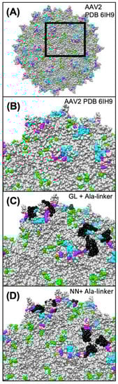 Figure 5. Modeling of the capsid epitopes of AAV2 WT and the variants AAV2.GL and AAV2.NN. Epitopes of known neutralizing monoclonal antibodies or serum (human and rabbit) of AAV2 are highlighted in different colors on the modeled structure of AAV2 WT (A,B) and the engineered capsids AAV2.GL (C) and AAV2-NN (D). Residues known to participate in the binding of the monoclonal antibodies A20 [28,29] and C37-B [28,30] are highlighted in green and cyan, respectively. Residues highlighted in magenta represent known epitopes for human and rabbit neutralizing antibodies [31,32,35]. Peptide insertions in AAV2.GL and AAV2.NN are highlighted in black. As is evident from the respective models, some of the epitopes are covered and occluded by the peptide insertions in AAV2.GL and AAV2.NN. Models were generated using the RoseTTAfold deep learning algorithm [36] available at https://robetta.bakerlab.org/ (accessed on 7 December 2021). The generated 3D models were visualized using the UCSF Chimera software (https://www.cgl.ucsf.edu/chimera/ (accessed on 7 December 2021).