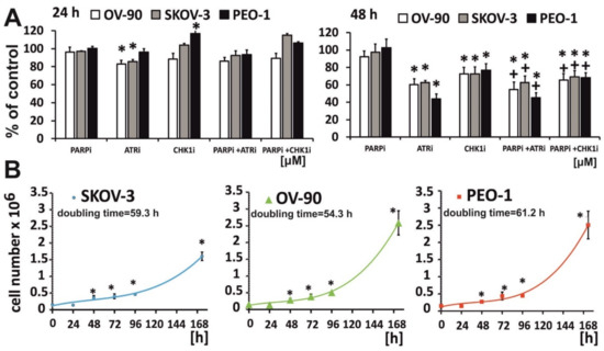 CHK1i or ATRi decreased cell (A) Cell viability after treatment with PARPi, CHK1i, and ATRi in BRCAMUT (PEO-1) and BRCAWT (OV-90, SKOV-3) cells at a concentration of 4 µM for 24 and 48 h was assessed by the MTT assay; (B) Cell doubling time was calculated from the cell growth curve during the exponential growth phase using the formula, Td = t/log2 (Nt/N0). * indicates statistically significant differences between samples incubated with the compound compared with control cells (p < 0.05); + indicates statistically significant differences between samples incubated with PARPi alone and the combination treatments (PARPi:ATRi; PARPi:CHK1i) (p < 0.05).